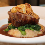 Alberta Beef Tenderloin with a red wine reduction on a bed of Yukon sweet potato mash and baby bok choy, topped with crispy shallot